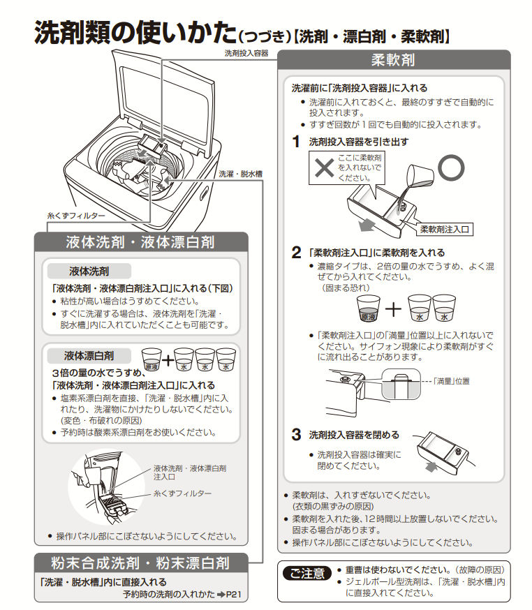 柔軟剤:洗剤投入容器の柔軟剤注入口に入れる