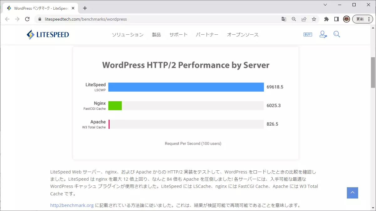 上記は同じ機器で、WordPress のリクエストを1秒間に何回処理できるかを測定したもののようですが、Nginx を LiteSpeed に変えると WordPress は約12倍の処理ができるようになるという結果のようです。LiteSpeed はキャッシュ機能が優秀なので同じリクエストは処理せずキャッシュから応答するので爆速なんでしょう。
