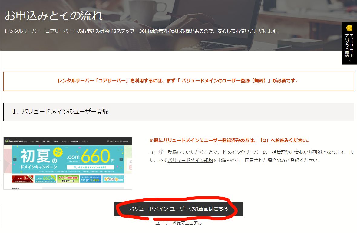 - コアサーバー > サポート > マニュアル > バリュードメインのユーザー登録 | マニュアル | サポート | レンタルサーバー CORESERVER(コアサーバー)