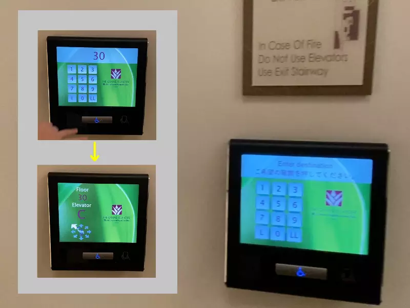 ちなみにグランドアイランダーはエレベーターホールにタッチディスプレイがあり階数を入力するとどのエレベータか教えてくれます。エレベーターの中は電光掲示板で現在のフロアと止まる予定のフロアが表示され、[開][閉][緊急]くらいしかボタンは無くシンプルで良かったです。