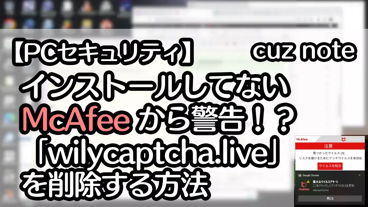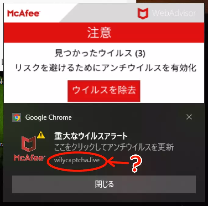 『ネットで調べようにもどうやって調べるかな?』と、McAfee のメッセージを良く見てみると『wilycaptcha.live』という謎の文字が表示されてます。