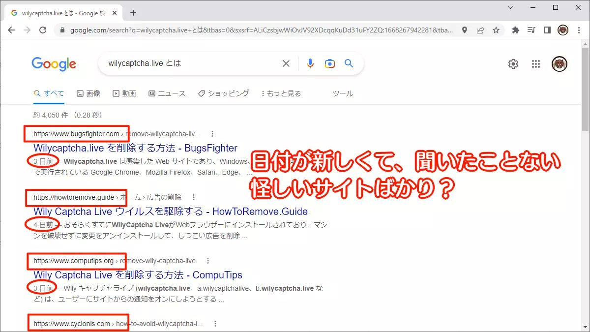 もしかすると「wilycaptcha.live」をエサにして削除方法を調べに来た人にマルウェアを仕込もうとしてる可能性があり、下手にアクセスすると二次被害が出そうです。