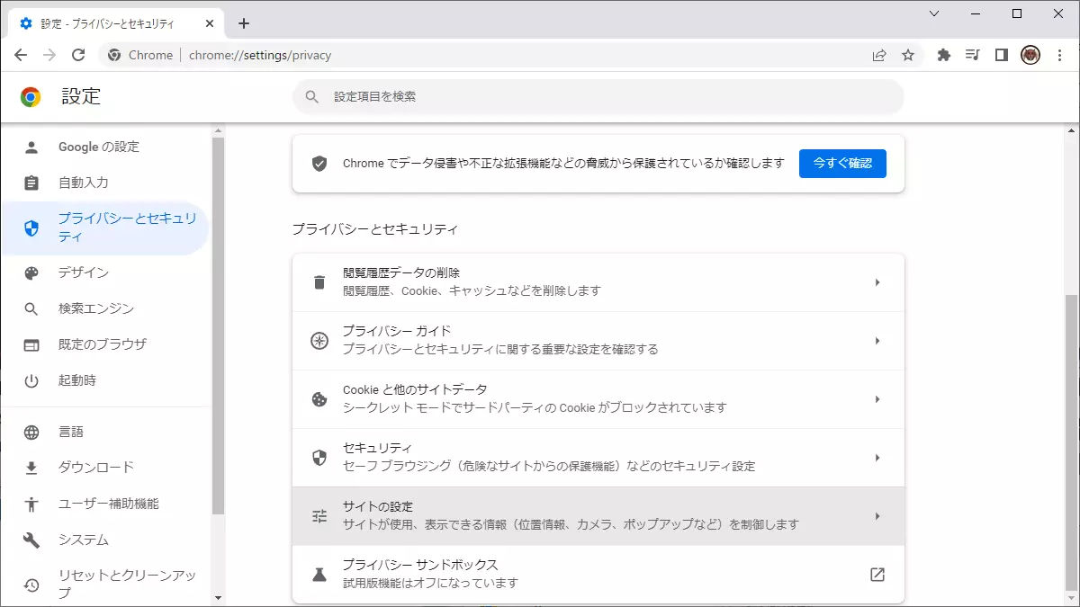 - Chrome の右上の「:」→「設定」→ 左メニューの「プライバシーとセキュリティ」