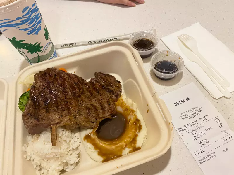 アラモアナセンターで美味しいものが無いかと検索すると、Steak & Fish Company のリブアイステーキの評価が高い。